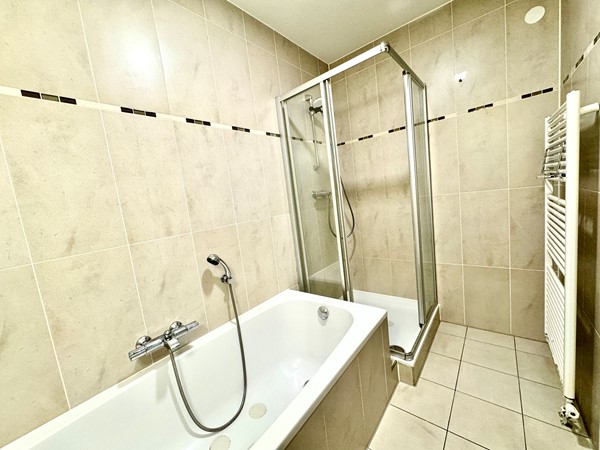 The bathroom has a walk in shower as well as wash basin, bath tub and a towel heater.